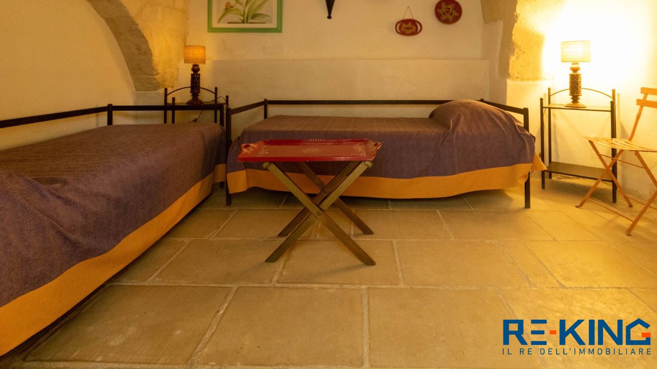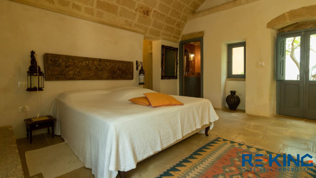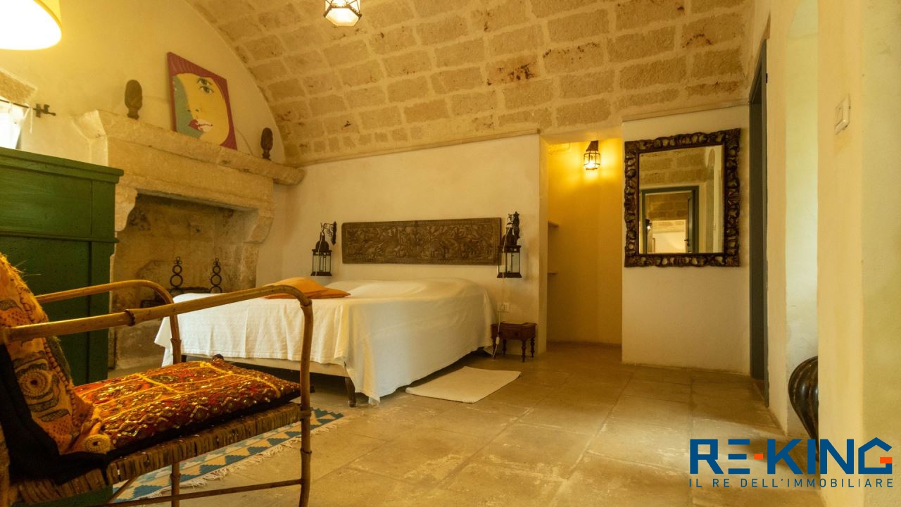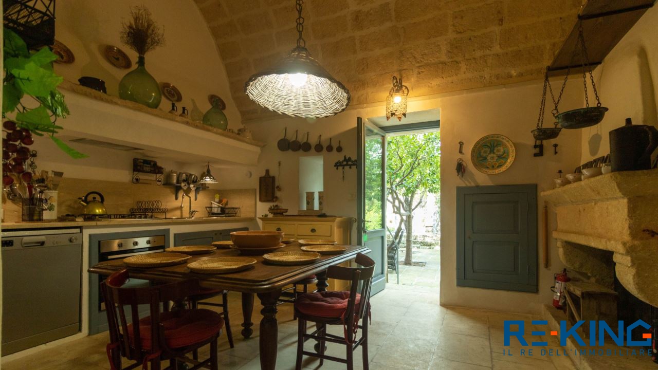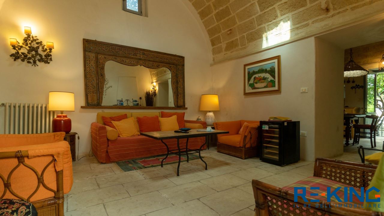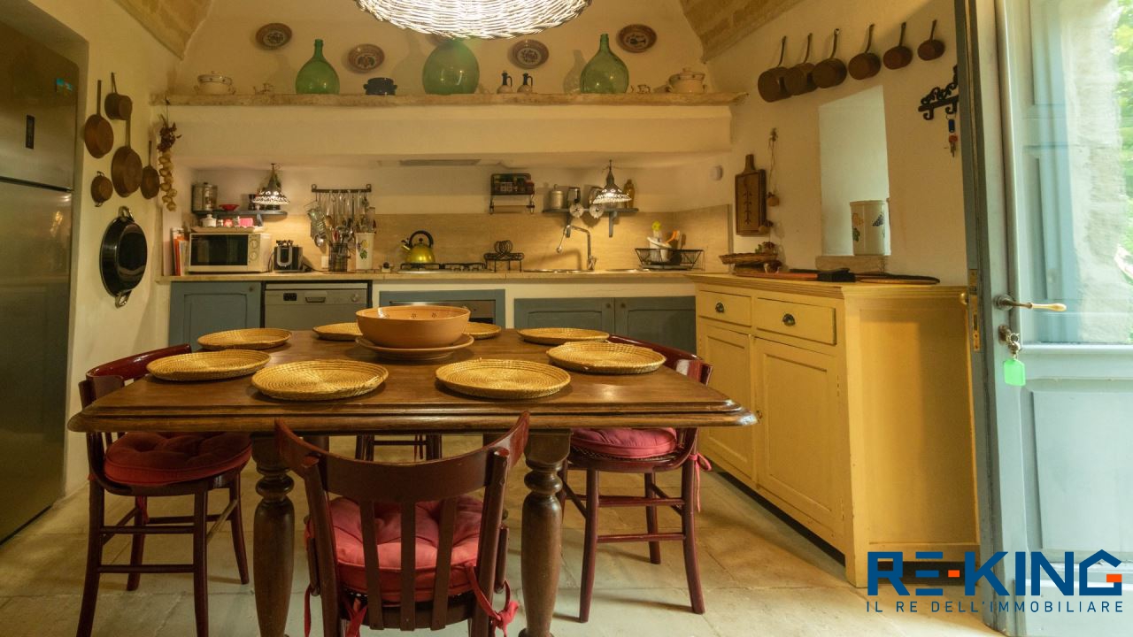 Al piano terra si trovano cinque camere matrimoniali con bagni en suite, ciascuna arredata con gusto e attenzione ai dettagli, tra cui una suite speciale composta da una camera principale e un salottino comunicante con due letti aggiuntivi, ideale per ospiti o famiglie numerose. Gli ambienti interni, luminosi e accoglienti, comprendono inoltre una cucina abitabile con angolo cottura in muratura tipico salentino, perfetta per preparare pasti in compagnia, e un soggiorno con zona living, accogliente e raffinato, ideale per momenti di relax o convivialità. Gli spazi si aprono su giardini e patii, creando un'atmosfera di intimità e tranquillità immersa nella natura.
